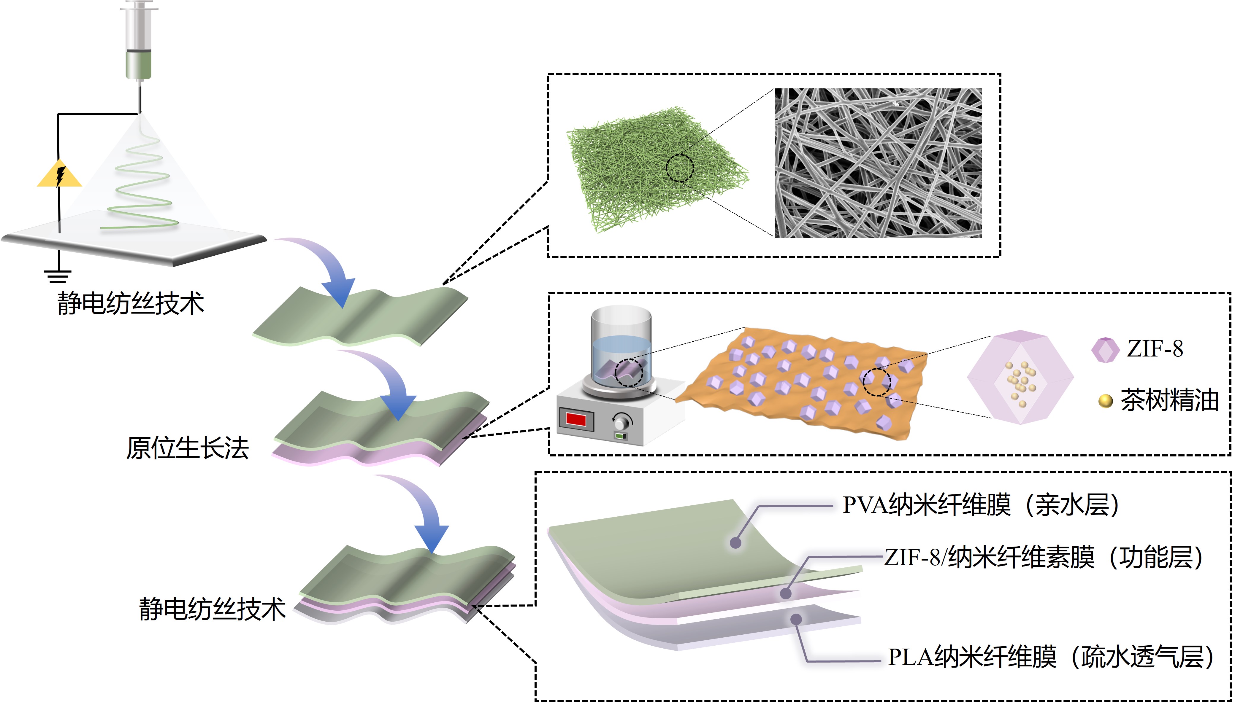 本项目设计的食品保鲜垫由导湿层/吸湿抗菌层/疏水透气层“三明治”式三层结构组成:芯层为木浆纳米纤维素(TOCNF)材料,其表面以原位生长法集成金属有机框架(ZIF-8)多孔纳米粒子,并负载茶树精油分子,从而兼具吸湿和抗菌功能;上表层为聚乙烯醇(PVA)纳米纤维膜,通过静电纺丝技术直接成型于芯层上,承担自上而下的定向梯度导湿功能;下表层为聚乳酸(PLA)纳米纤维膜,亦通过静电纺丝直接成型于芯层下表面,具有疏水透气功能。 该保鲜垫适用于生鲜肉类和水产品的保鲜,这些食品极易渗出汁液且易腐败变质,但目前市售保鲜垫仅具有有限的吸水功能,无法满足食品保鲜需求。所开发的“三明治”结构保鲜垫上层PVA纳米纤维膜与生鲜食品直接接触,材料的亲水特性使其快速吸收食品渗出的酸性汁液,并导流到中间层ZIF-8/TOCNF,酸性汁液触发中间层精油释放,发挥抑菌作用,同时汁液进一步从中间层导流到下层PLA纳米纤维膜,防止汁液聚集。通过保鲜垫三层协同作用,实现抑菌保鲜,同时保持包装盒内清洁卫生无渗液。