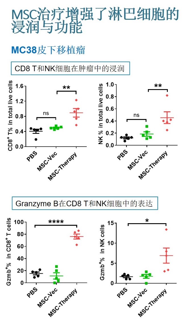 间充质干细胞在小鼠模型中表现出主动向肿瘤迁移的特性,并且对肿瘤的生长没有影响。过度表达免疫调节作用的趋化因子和免疫激活因子的间充质干细胞显著地抑制了小鼠结肠癌的发展。此方法在肿瘤部位激活杀伤肿瘤细胞的免疫反应,避免了全身用药带来的副作用,也打破了CAR-T细胞或者PD-1/PD-L1阻断等疗法中免疫细胞无法浸入肿瘤部位的瓶颈。